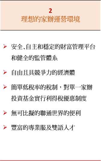 作為領先的國際金融中心和公認的財富管理中心,香港提供了一個富有許多獨特優勢供家辦運營和發展的理想環境。作為中國內地通往世界的門戶,香港還具有融匯東西方文化的獨特潛力,可以為來自東西方的商業家族孕育恒久的家族傳承,是家辦選址的明智選擇。
